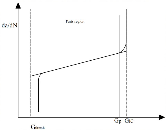 Crack growth was controlled using Paris’ law, combining the fracture energy release rate with the crack growth rate (see Figure 4). There were two limits; the first limit was the threshold energy release rate, , at which no fatigue crack initiation or propagation occurs, and the second was the upper limit energy release rate, , at which fatigue crack growth propagates at an accelerated rate. The limits are normalized using the critical fracture energy release rate as the ratio of and the ratio of , with default values of 0.01 and 0.85 chosen for these two limits, respectively.