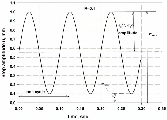 The models all require a step amplitude to generate the fluctuating load. The sine wave step shape was used with a frequency of 10 Hz. It is a fully reversed cyclic periodic step (see Figure 6) with voltage ratio and amplitude (). The step amplitude form is as follows [65]: