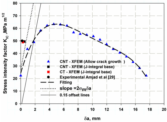 The Ti-27Nb alloy has a large plastic zone, so the 5% secant method proposed by the ASTM E399 standard is totally inappropriate for calculating the fracture toughness [66] since this method contains an intrinsic quantity that depends on the theoretical toughness. Therefore, the fracture toughness is preferably calculated using the J-integral method or the displacement of the crack opening. It is recommended to obtain the total R-curve. The central notch test recommended by Newman and Haines [43] was the simplest method to obtain the R-curve of ductile metal, so it was used to obtain the R-curve shown in Figure 7 (blue triangles). The initiation fracture toughness () can be determined as reported by Kobayashi [67], and it is the intersection of the parallel line with the truncating straight lines at a crack extension of 0.15 mm. It was the point of (48.9 ), and the corresponding fracture release energy is 24.88 kJ/m2 These values are very close when compared with the experimental data from Ref. [29]; the percentage errors for XFEM are 2.2% and 5.2%, respectively. Therefore, the R-curve is a good simulation of the material response. The slope of the truncating straight line can be extracted from Equation (19), as follows:
