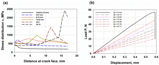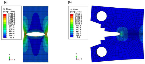 where is the yield stress, which is the average value between yield strength and ultimate strength, and δa is the crack length, which is 0.02 under static loading and 0.03 under dynamic loading [68]. The effect of the specimen shape and material behaviour is also illustrated in Figure 7. The single-point J-integral method FE (XFEM fixed-crack method) for the elastic or linear behaviour of a tensile specimen with a central notch and a controlled load at the point of first failure of 30,000 N (see Figure 8) for a central crack of 15 mm gives relatively similar values to the experimental data with a percentage error of 1% and 3% for the value of fracture toughness and the corresponding fracture energy, respectively. Moreover, the results of the linear or elastic model of the compact stress of a single-point FE J-integral method also provide reasonable and good results with a small percentage error of 2 and 4.5% for and , respectively. The results of the elastic model with different specimen shapes are acceptable and in agreement with the elastic–plastic model of XFEM and the model reported in [66]. Since the different specimen shape has little effect on the fracture toughness of the material fracture across microvoids, the fracture initiation value is the value at the first crack before the material involved plastic deformation zone. Table 2 shows the comparison between the model and the available experimental results. The stress distribution over the crack area is shown in Figure 8a. The stress was low for the initiation crack length of 10 mm, and after the crack propagated, the stress-take fluctuation appeared as a peak point, then the stress decreased and this point shifted to the right side of the curve. The maximum value of peak stress was just before the complete fracture of the specimen. After the peak load was reached, the crack began to propagate, and as the crack advanced, the load gradually decreased, as shown in Figure 8b. The point of first crack was observed at the buckling point or knee for a crack length of 10 mm at a load of about 39 kN. The last length, 43.17 was not the full length of the specimen (45 mm) because the specimen in XFEM did not separate completely. The Mises stress distribution over the specimen’s surfaces showed the stress concentration zone at the crack tip in red in both models (see Figure 9a,b).