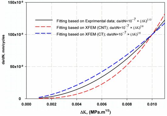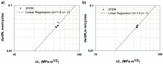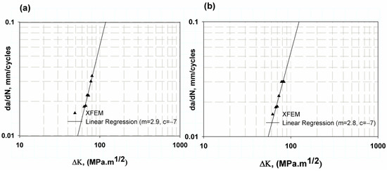 Figure 10 shows the growth of fatigue cracks for a specimen with a centre notch extracted using non-direct XFEM (static step with amplitude) and direct XFEM cycle fatigue. The log–logarithmic scale of the results was used to measure Paris’ law constants c and m. The results of the two methods are close to each other, which is due to the fact that the fracture criterion implemented in the direct cycle fatigue model uses the values of and calculated with the values of c and m predicted in the non-direct XFEM. The maximum average difference was 13.8 and 12, respectively, for the two models compared to the experimental results of Ref. [29], as listed in Table 2. This difference is accepted for fatigue results with large data points [62,69]. A centre notch tension specimen was used to determine the and components of the fracture criterion. The minimum value of dynamic fracture toughness change, ∆K, for the mean notch was 67.1 and 63.7961 , predicted in the two models with little change due to the change in crack length in each model being a factor change in each model. The change in crack length was small. Therefore, the corresponding calculated fracture toughness in Equation (4) was small.