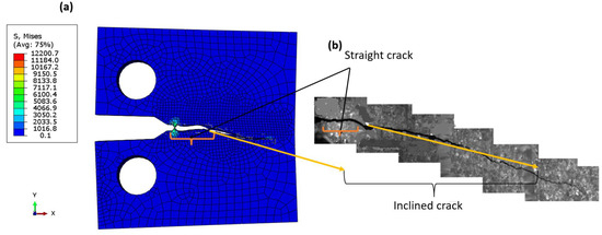Figure 12 shows the relationship between fatigue crack growth and the change in fracture toughness, ∆K, as predicted by Paris’ equation on a linear scale. It was found that the curves are close and there is little difference between the XFEM results and the experimental equation. However, the predicted values with CT stress were closer than those of CNT, and this was because the experimental data used the CT; therefore, there was a symmetry between numerical XFEM data. The fracture surface was well simulated in both models. For the elastic model (Figure 13a), the crack through two areas was straight, then inclined downward, and was almost smooth as shown by the experimental work of Ref. [70], which was due to the anisotropic structure of Ti-27Nb alloy in this orientation [70]. In the plastic model, the crack was shorter (Figure 14a) than the experimental image of Ref. [70]. The crack surface was not smooth but had a lamellar microstructure [13].