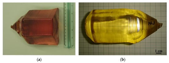 Crystals of the langasite family grown along axis [001]: (a) 4″ disordered La3Ga5SiO14 crystal (LGS); (b) 3″ ordered Ca3TaGa3Si2O14 crystal (CTGS).