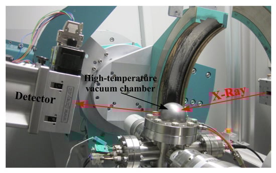 The studies were performed on an ARL X’TRA X-ray diffractometer. The ANTON PAAR HTK 2000 high-temperature chamber with a vacuum of 6 × 10−5 mbar was implemented for high-temperature investigations. An X-ray optical scheme of the diffractometer is shown in Figure 2. An X-ray tube with a Cu anode was used as an X-ray source. The lines were filtered with an Ni filter. Then, the X-ray radiation was collimated by the entrance slit with the size of 1 mm. Collimated X-ray radiation was diffracted on a powder of grown crystals placed on a W-heater in a high-temperature vacuum chamber. Diffracted X-ray radiation was recorded with a standard NaI scintillation detector with an input slit size of 1 mm. The W-heater provides the ability to change the temperature from room temperature to 2300 °C. The investigations were carried out in the temperature range from 25 °C to 1200 °C.