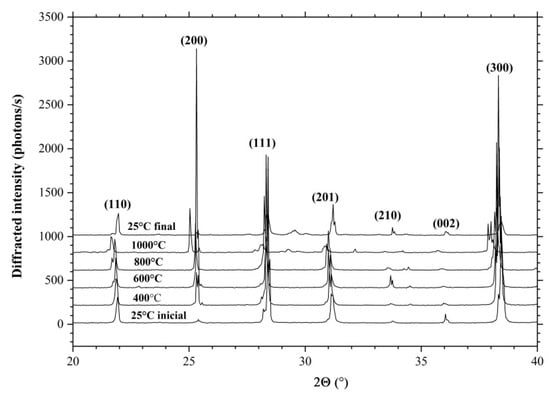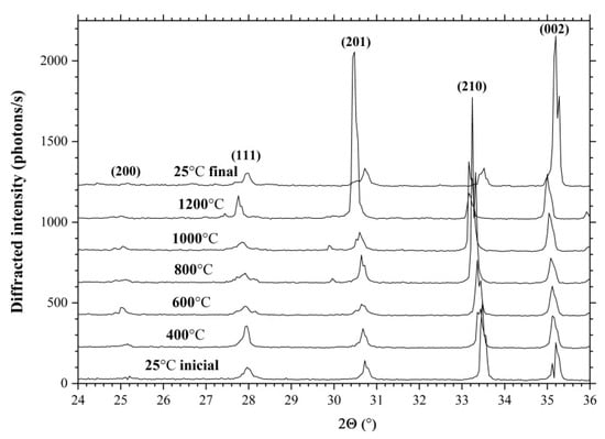 Figure 7 shows the diffraction spectra of the LGS crystal powder measured at 25 °C, 400 °C, 600 °C, 800 °C, 1000 °C, and 1200 °C. It can also be observed that the positions of the diffraction peaks shift with increasing temperature due to increasing interplanar spacing. In the temperature range of 25~800 °C, the change in the position of the diffraction peaks is linear, and at temperatures of 1000 °C and 1200 °C, there is a stronger change in the interplanar spacing due to the removal of Ga from the crystal structure.