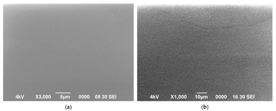 Figure 5 shows a micrograph of the Ca3TaGa3Si2O14 crystal surface obtained via scanning electron microscopy in the secondary electron emission mode before (a) and after (b) thermal treatment of the substrate at 1000 °C. In this case, a substrate was a cut from the CTGS crystal, and its surface was polished so that the surface roughness did not exceed 3 Å. The substrate was subjected to heat treatment in a vacuum, but only at temperatures above 800 °C was there a significant transformation of the crystal surface: the surface became porous. In micrographs, one can observe significant surface degradation due to the escape of Ga ions from the crystal lattice to the surface, followed by evaporation at high temperatures. That is, in this case, there is a decrease in the number of Ga ions in the crystal lattice. Therefore, it is advisable to determine the coefficient of thermal expansion within the temperature range up to 800 °C, where there is a linear dependence of changes in the angular position of diffraction peaks on X-ray diffraction spectra.