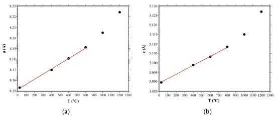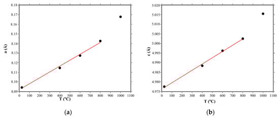 Figure 8 shows the dependences of changes in the parameters of the crystal unit cell (a) and (b) of the LGS crystal in the temperature range 25~1200 °C. In the figure, the black circles correspond to the experimental results based on the obtained diffraction spectra of Figure 6. The red lines are a linear approximation of the change in the crystal unit cell parameters as a temperature function, which were used to measure the thermal expansion coefficients. The values of thermal expansion coefficients for the LGS crystal were K−1 and K−1.