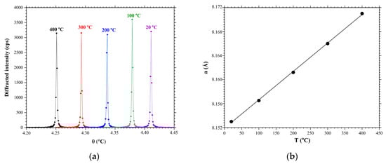 where is the interplanar spacing at room temperature and is the change in the interplanar spacing with the temperature change . As noted earlier, crystals of the point symmetry group 32 have two independent coefficients of thermal expansion along direction (direction [001]) and direction (direction [110]) . Thermal expansion coefficients of the CTGS crystal were determined based on the results of linear approximation of the change in the parameters of the crystal unit cell in the temperature range 25–800 °C. The values of the thermal expansion coefficients for the CTGS crystal calculated from expression (1) were K−1 and K−1, respectively. These values are in a good agreement with the values ( K−1 and K−1) obtained in [] when the change in the length of the CTGS crystal bar was measured at varied temperature conditions. It should also be noted that the article [] demonstrated the nonlinear behavior of the coefficient of thermal expansion at temperatures below 0 °C. Additionally, present studies demonstrate a deviation of the coefficient of thermal expansion from linear at temperatures above 800 °C due to the decrease in Ga in the crystal lattice.