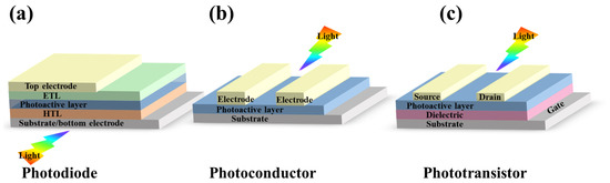 Semiconductor photodetectors are mainly divided into three categories according to their structures: photodiodes, photoconductors, and phototransistors. The structures of various types of detectors are shown in Figure 1. Photodiodes have narrow charge transit distance and an inner electric field; thus, they usually have fast response speed, low noise, and large detectivity, but suffer from low responsivity and external quantum efficiency (EQE). The working principle of the photodiode is as follows: when incident light with a certain energy irradiates to the junction region, electrons will transit from valence band to conduction band, resulting in the formation of a photogenerated electron-hole pair. Under the influence of the electric field, the minority carriers and the photogenerated electron holes generated in the depletion region move towards the electrodes at both ends, where they are collected by the electrodes, generating a photocurrent. In contrast, photoconductors have large responsivity/EQE because of the photoconductive gain but usually show low response time and small detectivity. The working principle of the photoconductor is similar to the photodiode except that the junction is usually a Schottky contact. Phototransistors would present balanced parameters among these three structures. For phototransistor detectors, they often exhibit a high internal photocurrent gain due to the inherent amplification function.