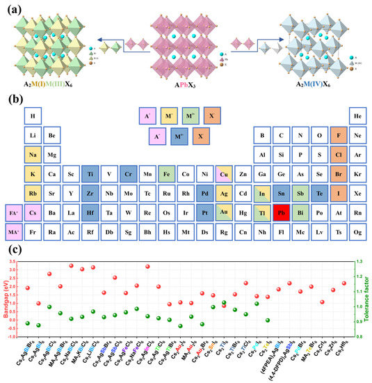 (a) The structure evolution from lead-based perovskite to lead-free double perovskite. (b) Summary of the synthesized lead-free double perovskite materials. (c) Summary of the bandgap and tolerance factor of the lead-free double perovskite materials mentioned in this review.