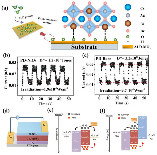 In 2018, the double perovskite Cs2AgBiBr6 film prepared by the one-step spin-coating method was first used in photoconductive photodetectors, presenting a high responsivity of 7.01 A W−1, a specific detection rate of 5.66 × 1011 Jones, an on/off photocurrent ratio of 2.16 × 104, and a fast response rate of 956/995 μs [12]. This work provides prospects for the development of Cs2AgBiBr6 lead-free perovskite in photoelectric detection applications. To manufacture Cs2AgBiBr6 photodetectors with a wider response range, higher responsivity, and higher detection rate, it is necessary to carefully tune its bandgap and optimize the interface between electron/hole transport layers (ETL/HTL) and the perovskite absorber layer. For example, in 2020, using H2O vapor and high purity N2 as the reactant and carrier gas, Mai et al. [13] successfully fabricated ultra-thin ALD-MOx layers (ALD-TiO2, ALD-Al2O3, and ALD-NiOx) by depositing titanium tetrachloride (TiCl4), trimethylaluminum, and nickelene on FTO glass substrates, respectively. Then, they used them as hole transport layers to fabricate weak light photodetectors with the structure of FTO/ALD-MOx interlayer/Cs2AgBiBr6/ETL/Au. Figure 3a describes the schematic diagram of Bi-O bond formation at the interface between the ALD-Al2O3 (Atomic layer deposition-Al2O3) modified substrate and Cs2AgBiBr6 film. Compared with the bare devices of photodetectors, the switching ratio was increased by 10 times, and the minimum detection radiation was reduced from 9.7 × 10−8 W cm−2 to 1.9 × 10−9 W cm−2 (Figure 3b,c), and the detection rate was improved from 3.3 × 1011 Jones to 1.2 × 1013 Jones (Figure 3b,c). This is because the Bi-O (or Ag-O) bond formed between the MOx substrate and the perovskite interface contributes to the improvement of the quality of the Cs2AgBiBr6 film, resulting in films with large grain size and reduced pinholes. It is also known that proper ETL and HTL can help to optimize the perovskite morphologies and greatly improve the photocarrier transport efficiency, which is conducive to realizing high-performance photodetectors. Benefiting from the intrinsic p-type semiconductor nature and the satisfying properties of adequate energy levels, high hole mobility (1.2 × 10−3 cm2 V−1 s−1), and good thermal stability, inorganic copper thiocyanate (CuSCN) has attracted widespread attention for its application on perovskite-based devices as an HTL [14,15,16]. Inorganic thiocyanate (CuSCN) was introduced to work as the HTL for a self-powered Cs2AgBiBr6 photodetector in 2020 [17]. The device structure is shown in Figure 3d. Compared with devices without a CuSCN HTL, the light detection limit was reduced from ~7 × 10−9 W cm−2 to 1 × 10−9 W cm−2, which facilitated its usage for weak light imaging. The specific detection rate was increased from 1.74 × 1012 Jones to 1.03 × 1013 Jones and the responsivity was increased from 0.04 A W−1 to 0.34 A W−1, which was because the CuSCN hole transport layer can improve the device carrier separation and collecting efficiency. Under ideal conditions, the Cs2AgBiBr6 absorbs photo energy to generate carriers. The built-in electric field separates the carriers into electrons and holes. The electrons flow to the FTO layer, and the holes move to the Au electrode, which minimizes the recombination of carriers and generates the effective output of electrical signals. However, as illustrated in Figure 3e, since the work function of the Au electrode is located between the top of the valence band and the bottom of the conduction band of Cs2AgBiBr6, both electrons and holes will flow to the Au electrode and cause the energy losses. After introducing the CuSCN hole layer, the electron pathways to Au are blocked and the holes can be collected more efficiently, and thus the performance of the device is greatly improved.