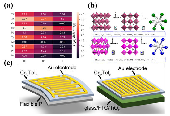 (a) Results of bandgap prescreening of the 30 studied perovskites. Reprinted with permission from Ref. [66], 2022, Wiley. (b) The crystal structures of MA2TeI6 and MA2TeBr6. Reprinted with permission from Ref. [69], 2019, American Chemical Society. (c) Sketches of Cs2TeI6 detector structures based on the flexible PI and rigid FTO substrates. Reprinted with permission from Ref. [71], 2021, American Chemical Society.
