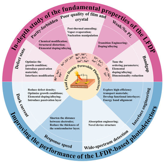 As mentioned in the previous section, lead-free double perovskite photodetectors have received a lot of research attention in recent years and have achieved impressive progress. Despite the tremendous progress in photodetection, there are still many challenges in the future direction of this field, which may hinder the development of lead-free double perovskite and limit its potential applications. We systematically summarize the challenges faced by the use of various types of lead-free double perovskite to fabricate higher-performance photodetectors, and we propose the corresponding solutions, as summarized in Figure 6 and discussed as follows: