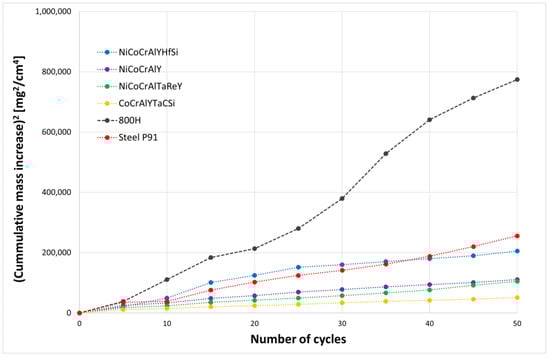 The parabolic graph of weight gains per area unit related to the number of cycles for all evaluated coatings exposed to 50 cycles of the high temperature corrosion test in 75% Na2SO4 and 25% NaCl at 800 °C. References are uncoated boiler firewall or heat exchange tube representing bulk steel P91 and alloy 800 H (brown and dark grey plots, respectively).