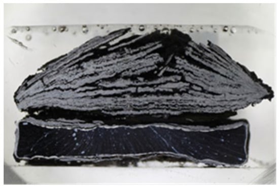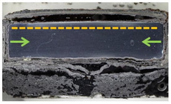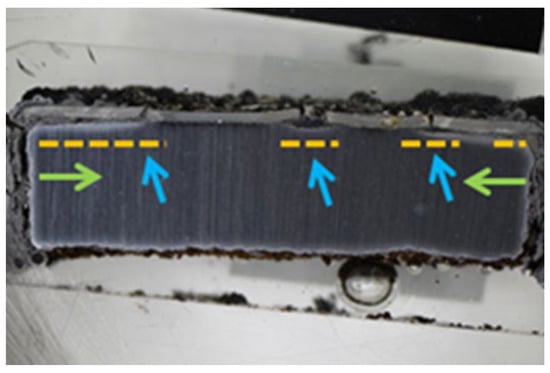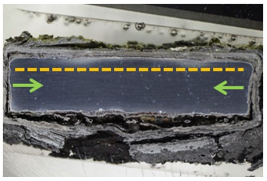 The loss of flatness and layering of the corrosion products along the specimen perimeter show that all uncoated surfaces of the NiCoCrAlY-coated specimen were corroded during exposure to the corrosive environment of chloride salts. The macroscopic image in Figure 8 shows a severe corrosion attack on the uncoated underside of the base material.