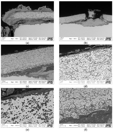 SEM analysis images in the cross-section of the NiCoCrAlTaReY-coated specimen after the exposure to the corrosive environment: (a) left side area with 100×, (b) center area with 100×, (c) center area with 300×, (d) center area—coating surface with 1000×, (e) center area—coating surface with 3000×, (f) center area—coating underside with 3000×.
