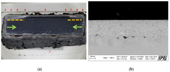 (a) Macroscopic cross-section image of the CoCrAlYTaCSi-coated specimen after the exposure to the corrosive environment, area 5—(b) SEM analysis image with 200×—the coating center taken from an area 5 (red number 5 on the image (a)).
