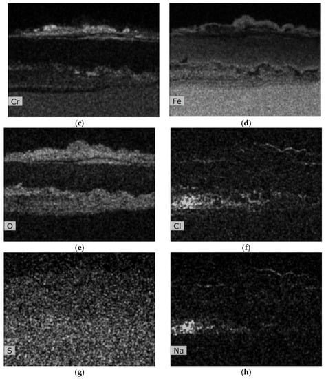 In the case of the corrosive environment containing only sulphates, sulphur oxide reacts with ferric oxide and forms ferric sulphate (Equation (9)). However, if the corrosive environment also contains chlorides, sulphur dioxide may also react with sodium oxide to form sodium sulphate and chlorine. Sulphates cause corrosion at splat boundaries compared to chlorides that cause internal corrosion. The presence of sulphur in the form of sulphates can cause internal alloy sulfidation under the protective oxide layer. Only a small amount of sulphides is formed in the corrosion layer [1,3,4,7,8].