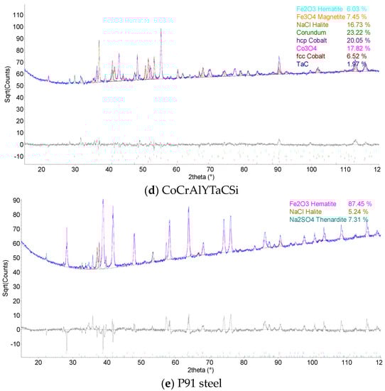 A phase composition evaluation by XRD analysis of selected coatings after the corrosion test and steel P91 for reference is depicted in the Figure 18. The detected phases for each specimen are summarized in the Table 1. The analysis was carried out on the surface of the specimen and the penetration depth of the radiation used was approximately 10–30 μm. All the samples analyzed contained iron oxide phases in the form of Fe2O3 and/or Fe3O4, which originated from the P91 steel substrate material. In most cases, sodium sulphate Na2SO4 and sodium chloride NaCl, as remnants of the corrosive environment, were present in minority in all samples. Aluminum oxide Al2O3 was detected in the NiCoCrAlYHfSi, NiCoCrAlY, and CoCrAlYTaCSi coatings, which probably formed an oxide protective barrier. In addition, cobalt oxide in the form of Co3O4 was present in the CoCrAlYTaCSi coating.