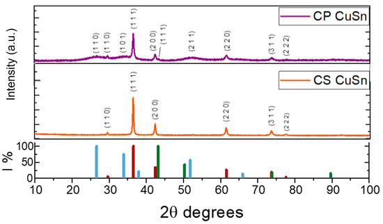 XRD of co-precipitation (CP) and core–shell (CS) samples; from the top: CP (purple line) and CS (orange line). The graph in the lower part of the figure reported the relative intensities of the Cu2O, Cu, and SnO2 peaks (red, green, and blue lines, respectively).