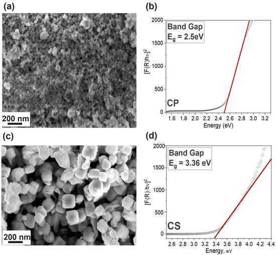 Morphology images obtained by FESEM analyses ((a,c) for CP and CS samples, respectively) and Tauc plot ((b,d) for CP and CS samples, respectively) for band gap determination In Tauc’s plots, the black dots represent the [F(R)hν]2 trend for each sample, while the red line is the tangent to the first linear section of the curve.
