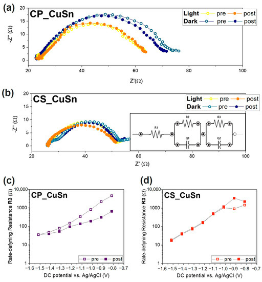 EIS analysis of the CP and CS catalysts: (a,b) Nyquist plot of CP and CS catalysts, respectively, obtained during the “pre” and “post” campaigns of measurement carried out at −1.5 V vs. Ag/AgCl in CO2-saturated environment both in dark and light conditions; (c,d) Equivalent resistance R3 trends of (c) CP and (d) CP samples, where open symbols represent the “pre” measurements while solid ones, labelled “post”, represent measurements executed after chronoamperometry. R3 values were calculated through a fitting procedure using the equivalent electrical circuit shown in (b).