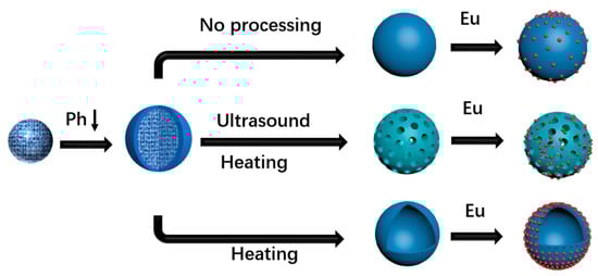 Previous research on the combination of rare-earth metals and silica has predominantly focused on silica fibers or thin films [57], while studies exploring the combination of distinct structures of spherical silica and rare-earth complexes have been scarce. This study aimed to address this gap by preparing silica spheres with varying degrees of internal and external shrinkage. Through ultrasonic and heating treatments, silica spheres with diverse morphologies, including solid, mesoporous, and hollow structures, were successfully obtained. The rare-earth complex Eu(TTA)3phen was subsequently adsorbed onto the surfaces of these silica spheres, resulting in impressive fluorescence performance (Figure 1). A comparison of the fluorescence performance with other structures of SiO2@Eu(TTA)3phen revealed that mesoporous SiO2@Eu(TTA)3phen exhibited superior performance and demonstrated significant potential in battery devices. Furthermore, the fluorescence intensity variations and cyclic stability of SiO2@Eu(TTA)3phen and Eu(TTA)3phen were evaluated under different environmental temperatures and pH values, with SiO2@Eu(TTA)3phen demonstrating excellent performance.