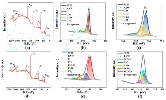 The C 1s XPS analysis, depicted in Figure 6b,e, provides valuable insights. It reveals the presence of stable CF3 peaks at approximately 292 eV for both Eu(TTA)3phen and Si@Eu, originating from the TTA ligand. Furthermore, C-O and C=O peaks are observed at 286 eV and 288 eV, respectively. Notably, Si@Eu exhibits an additional peak at 287 eV, which arises from the reaction between the C=O bond in the TTA ligand and the -OH groups on the surface of the silica. This reaction leads to the formation of a C-O-Si bond. The fitting results of the oxygen peak, displayed in Figure 6c,f, indicate that the binding energy of the O-Eu bond in Eu(TTA)3phen is measured at 530 eV. In comparison, S@Eu not only forms bonds with the O atoms in the ligand but also establishes a Si-O-Eu bond with the O atoms on the surface of the silica, resulting in a peak located at 535 eV. The abundance of Si-O-Si bonds indicates that the primary component of S@Eu is still silica. Moreover, infrared analysis confirms the coexistence of both physical adsorption and chemical bonding between the silica and Eu(TTA)3phen.