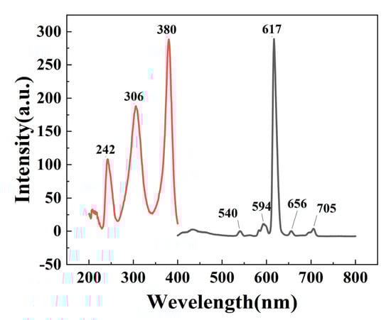 The excitation peak is shown in the left panel of Figure 7, with the normal f-f absorption of Eu3+ occurring around 380 nm, the absorption of TTA and phen ligands appearing around 306 nm, and the π-π* transition of TTA at around 240 nm. Fluorescence emission spectra were measured with the strongest excitation at 380 nm, as shown in the right panel of Figure 7, exhibiting a characteristic emission peak at 617 nm, which corresponds to the 5D0→7F2 (617 nm) transition of Eu3+. The other two peaks at 594 nm and 656 nm correspond to the 5D0→7F1 and 5D0→7F3 transitions, respectively. The emission peak at 617 nm is the strongest, while that at 656 nm is the weakest, indicating the characteristic fluorescence emission of Eu3+. The position of the peak is essentially the same as previously reported [59].