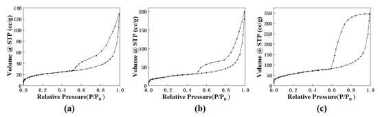 N2 adsorption-desorption isotherms: (a) SiO2; (b) hollow SiO2; (c) mesoporous SiO2.