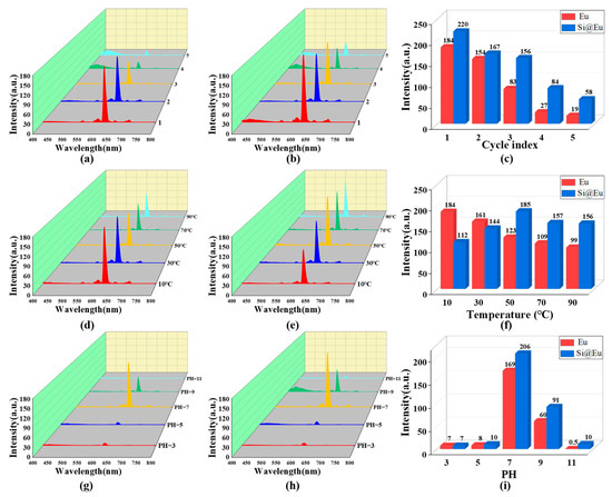 (a) Fluorescence intensity of Eu(TTA)3phen varies with the number of cycles. (b) Fluorescence intensity of S@Eu varies with the number of cycles. (c) Cyclic stability. (d) Fluorescence intensity of Eu(TTA)3phen varies with temperature. (e) Fluorescence intensity of S@Eu varies with temperature. (f) High-temperature resistance. (g) Fluorescence intensity of Eu(TTA)3phen varies with pH. (h) Fluorescence intensity of S@Eu varies with pH. (i) Acid–alkali resistance.