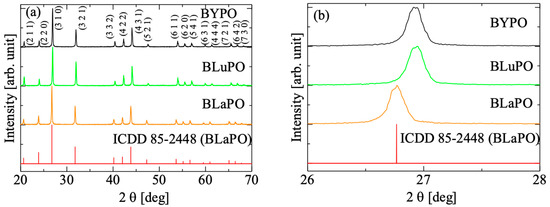 Figure 2a shows the XRD patterns of the BREPO samples and a reference pattern of BLaPO (ICDD 85-2448), and Figure 2b indicates the expansion around 27°. All the samples showed identical peak pattern of BREPO without impurity phase. The results indicated the samples shown in Figure 1 were single phase of BREPO. From Figure 2b, the peak shift due to the differences of RE3+ site was observed. The BREPO compounds belonged to a cubic crystal structure with space group of I3d. The unit cells were composed of an isolated PO4 tetrahedron and an edge-shared RE/Ba octahedron. The diagrams of the lattice structure of BREPO were reported by previous studies [26,27]. The ionic radii of the Y3+, La3+, and Lu3+ ions were 0.900, 1.390, and 0.861 Å, respectively [28]; therefore, the peak shift was consistent with the difference in the ionic radii.