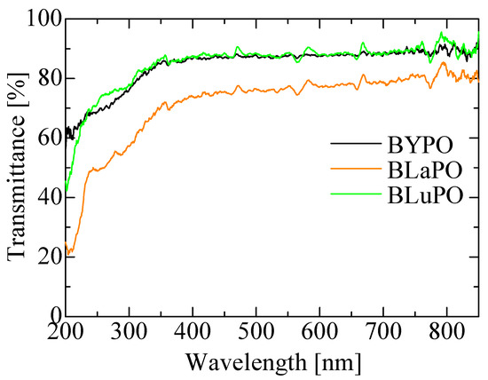 Figure 3 shows the diffuse transmission spectra of the BREPO samples. All the samples indicated high transmittance, around 80%, in the visible region. The BLaPO sample showed slightly lower transparency than BYPO and BLuPO samples; it was due to the cracks in the sample. The transmittance gradually decreased from 350 nm; however, the absorption edges of the samples were beyond the measurement limit of the apparatus (200 nm). Therefore, the optical band gaps of the BREPO samples were confirmed to be above 6.2 eV.