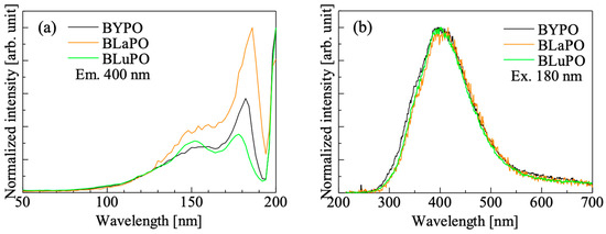 Figure 4 shows the VUV-irradiated PL (a) excitation and (b) emission spectra of the BREPO samples. The samples showed an excitation peak at 180 nm with a shoulder peak around 150 nm when the monitoring wavelength was set to 400 nm. Similar peaks have been observed in some orthophosphate materials, and the origin of the excitation peak was attributed to the absorption due to PO43− [25,29,30,31]. Under excitation at 180 nm, all the samples showed a broad emission peak around 400 nm. The features of the emission such as emission wavelength, large stokes shift, and broad band width were matched the features of self-trapped exciton (STE) [32], and some phosphates also exhibited luminescence due to excitons at similar wavelengths [33,34,35]. Therefore, the luminescence origin of the BREPO samples was considered to be due to STE.