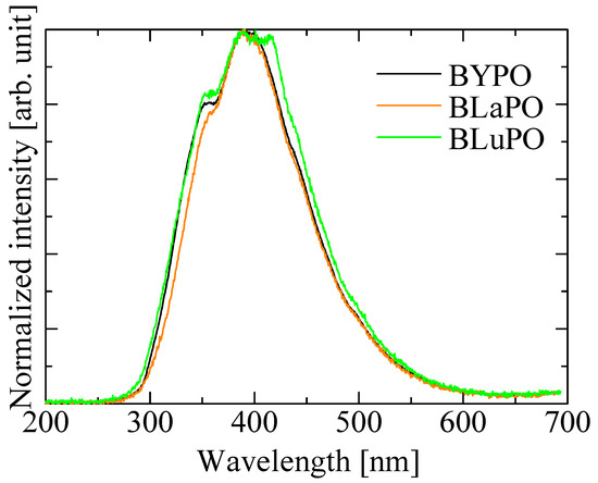 Figure 5 shows the X-ray-induced scintillation spectra of the BREPO samples. All the samples exhibited a broad emission band around 400 nm. The emission wavelength and the spectral shape coincided with the luminescence observed in PL emission spectra under VUV irradiation. Therefore, the luminescence origin was ascribed to STE. The luminescence wavelength around 400 nm was suitable for detection by using the typical photodetectors.