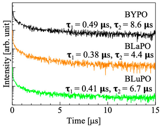 Figure 6 shows the X-ray-induced scintillation decay time profiles of the BREPO samples. Note that the measurement was taken at room temperature. The decay curves of the samples were expressed by the sum of two exponential decay functions. The fast and slow decay time constants were several hundreds of milliseconds and several microseconds, respectively. The fast decay time constant was due to the instrumental response’s function. The slow decay time constant was consistent with that of STE, which was previously reported in some materials at room temperature [36,37]. This result supported that the luminescence observed in Figure 5 was due to STE. However, the accurate measurement of the scintillation decay time profiles was difficult because of low luminescence intensities and high Af values (described later) of the samples. Therefore, the discussion about relation or influence of the difference of RE site on scintillation decay time constants was difficult in this time.