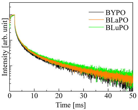 Here, IBG, I1, and I2 are the background signal intensity, the signal intensity during X-ray irradiation, and the signal intensity obtained 20 ms after the irradiation was cut off, respectively. The obtained Afs were 1.01, 1.06, and 1.20% for the BYPO, BLaPO, and BLuPO samples, respectively. These Afs were quite higher than those of the oxide-based eulytite compounds BGO (10.1 ppm) and Bi4Si3O12 (192.3 ppm) measured by same setup [38,39].