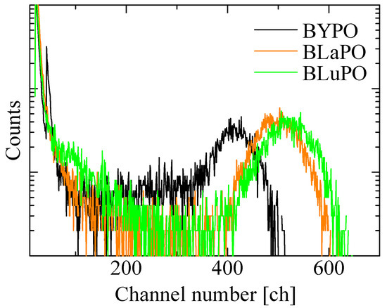 Figure 8 shows the 241Am α-ray-irradiated pulse height spectra of the BREPO samples. The obtained LYs were summarized in Table 1, as with the Afs. All the samples exhibited full energy peaks. The absolute LYs of the BYPO, BLaPO, and BLuPO samples were estimated to be 960, 1160, and 1220 ph/5.5 MeV-α, with a typical error of ±10%. The LYs of the samples were lower than those of the BGO scintillator. One of the reasons for the low LYs was due to the high Afs. Afterglow is a type of storage-type luminescence caused by electron captures at some defect centers and re-excitations by weak thermal energy derived from room temperature. A high Af means a large number of electrons captured at defect centers; in other words, the energy migration efficiency in the scintillation process is low [40]. As the synthesized BREPO samples had opaque and cracked parts, the amounts of defect centers were considered to be high. Improving crystal quality and reducing defects are required for lower Afs and higher LYs. In addition, the scintillation decay time constants of several microseconds for the BREPO samples were too long for the pulse height measurement, with a shaping time of 10 μs. This discrepancy led to the underestimation of the LYs. Therefore, doping some impurity ions such as the Ce3+ ion is interesting to achieve faster decay time constants and higher LYs. On the other hand, there was a correlation between Afs and LYs among the BREPO samples. LY depends on not only energy migration efficiency but also quantum efficiency at luminescence centers [41]. Hence, this result implies that the sample containing heavier element possibly had a higher quantum yield of STE. The investigation of quantum yield under VUV excitation is an intriguing topic to further elucidate the scintillation mechanism.