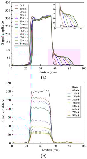 The moisture distribution curve of RAC absorbing water from the mortar with w/c = 0.5 is shown in Figure 4b. As the cement hydrates, the free water in the fresh mortar is gradually converted into bound water in the hydration products, which leads to a weakening of the moisture signal intensity in the fresh mortar, resulting in a gradual decrease in this section of the curve. Meanwhile, it can be observed that there is no change in the curve inside the SRA from 0 to 900 min, indicating that no migration of water to the inside of the recycled aggregate is monitored.