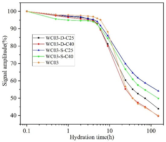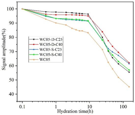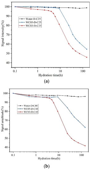 The signal intensities of WC03-D-C25 and WC05-D-C25 were very close to each other and remained stable within 5 h at the beginning of the test, because both were in the induction period of hydration. After 5 h, the curve of WC03-D-C25 was the first to show an inflection point and the slope of signal decay was greater, which indicated that the hydration rate of WC03-D-C25 was greater than that of WC05-D-C25. According to ref. [,], high w/c dilutes the OH− and Ca2+ ions in the cement paste, thus delaying the reaction rate of hydration. At the end of monitoring, the signal intensity of WC05-D-C25 still maintains a decreasing trend, while the decreasing trend of the curve of WC03-D-C25 has diminished. Therefore, it can be inferred that the cement paste with w/c = 0.5 may be more fully hydrated in the subsequent hydration stage because of the presence of sufficient water compared to the paste with w/c = 0.3.