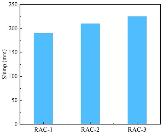The slump results of the RAC are shown in Figure 9. The slump of all three groups of mixtures could reach the design target after the addition of PS. Although RAC-1 had the highest amount of PS, the slump was significantly lower than RAC-2 and RAC-3, which was due to the lower water consumption of RAC-1, while the w/c was the main factor to determine the slump of concrete. After adding the same amount of WAC, the slump of both RAC-2 and RAC-3 was significantly improved, and the improvement of RAC-3 was greater than that of RAC-2, which was due to the existence of the water film on the surface of recycled aggregate when wetting it in advance, which played the role of lubrication [].