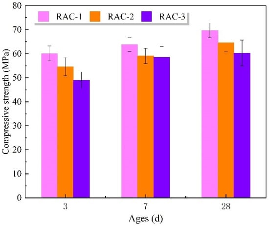Assuming that the recycled aggregate absorbs water in fresh concrete, the actual w/c of RAC-1 is supposed to be lower than 0.24. Because of the lower w/c, the strength of RAC-1 is supposed to grow faster and should be higher than that of RAC-2 within 3–7 days. Then, because of the low water consumption, the cement of RAC-1 was not fully hydrated, resulting in a lower compressive strength than that of RAC-2 at 28 days []. This is contrary to the experimental results shown in Figure 10, where the actual test results show that the compressive strength of RAC-1 is consistently higher than that of RAC-2 within 28 days. This supports the conclusion of the LF-NMR imaging study that the WAC in fresh concrete is actually difficult to be fully absorbed by the recycled aggregate. It is worth noting that high strength recycled concrete has a low w/c and therefore the WAC has a greater effect on the w/c. The w/c of RAC-2 and RAC-3 is increased by 33% compared to that of RAC-1, which is the main reason for the decrease in compressive strength.