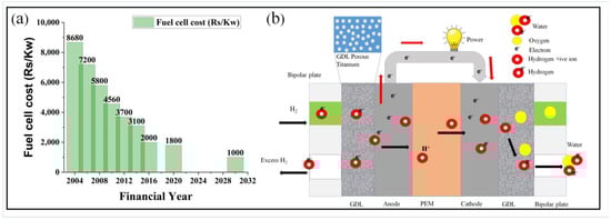 (a) decreasing price of fuel cells in the Indian market [8], and (b) schematic of PEM fuel cell.