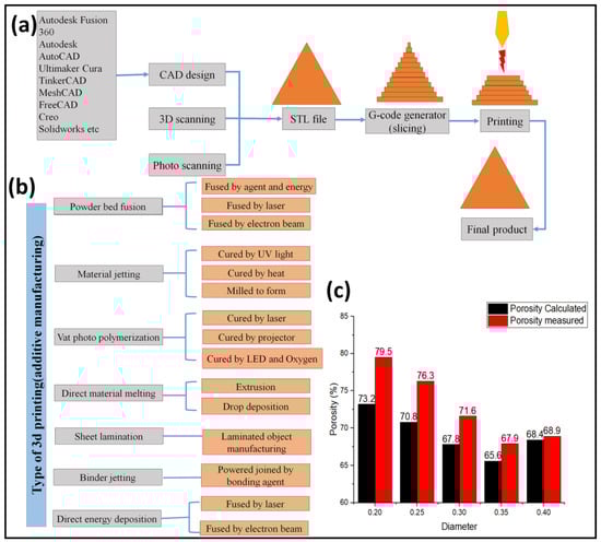 Nowadays, additive manufacturing is the most powerful technique for fabricating porous material with complex internal and overall designs having enhanced properties compared to the other fabrication methods. The Additive manufacturing technique is well known for its versatility and accuracy [43]. 3D printing is not just restricted to the porous material. However, it has been widely used in the biomedical, transportation, health sector, aerospace, marine, power sector, fashion industry, firearm industry, education sector, food industry, culture heritage, and museum-based digital twin, to name a few. As shown in Figure 6a. the 3D printing (rapid prototype) includes making a design (by 3D scanning or cad designing or photo scanning), then it is exported in an STL file, followed by the G-code generation for slicing the model and then printing by a 3D printer which moves in x, y and z direction to print layer by layer. Finally, the surface is machined if it is needed. In metallic printing, the powder is fused into the designed pattern layer by layer with the help of high-density radiation with high accuracy [44,45].