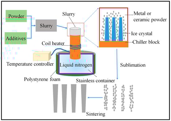 Freeze casting (also called ice templating) is an amazing process for producing porous material with aligned pores that are adaptable to various materials. This aligned porous material made by freeze casting has wide applications, especially in the biomedical industry. Freeze casting involves making slurry and pouring it into the mold, followed by controlled solidification and sublimation. Finally, the debinding and sintering processes are carried out to remove the additives and increase the strength of the porous material, respectively, as shown in Figure 7 [51].