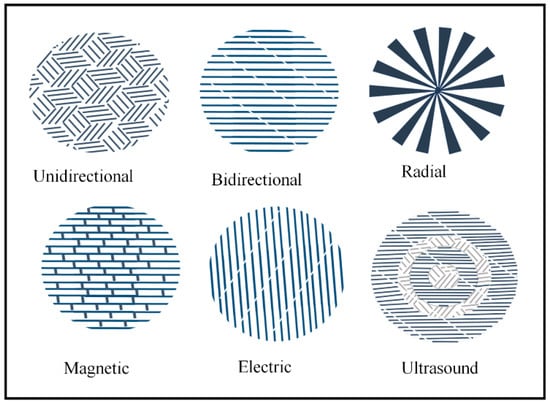 Furthermore, directional freezing is favored for complex geometry. After solidification, the solvent is extracted from the suspension through sublimation which is the direct conversion of the solid into a gaseous phase under the controlled condition of pressure and temperature. Pores are generated in the material after the removal of the solvent with the same monolith as that of ice. The sublimation did not widely affect the microstructure of the porous material in freeze casting. Various types of freeze casting and the alignment of pores are shown in Figure 8 [52,53].