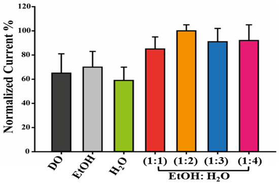Dispersions optimization. Histogram reporting the current recorded using HAp dispersed in 1,4-Dioxane (DO), Ethanol (EtOH), Water (H2O), and EtOH: H2O mixture (1:1, 1:2, 1:3, 1:4 vv−1) to modify the WE of SPEs.