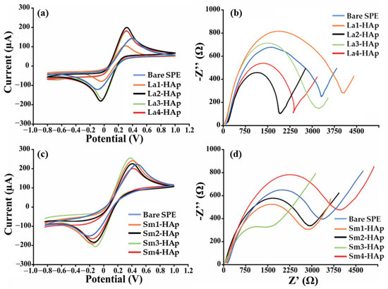 Electrochemical characterization of La- and Sm-doped HAp-modified SPEs. (a,c) Cyclic voltammograms and (b,d) Nyquist’s plot recorded in 10 mM [Fe(CN)6]4−/3− in 50 mM PBS using La-HAp- and Sm HAp-modified SPEs.