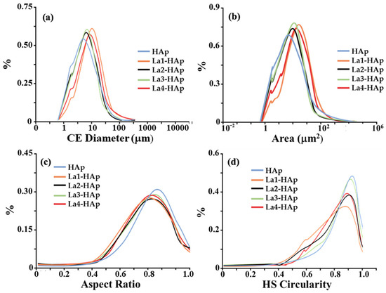 Morphological analyses of pure and La-doped HAp samples: (a) ‘circle equivalent’ (CE) diameter distribution curve (logarithmic scale); (b) particle area (A) (logarithmic scale); (c) aspect ratio = width/length ratio; and (d) HS circularity = 4 μA/P2 (A = area and P = perimeter).