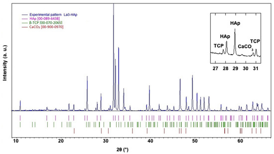 Experimental diffraction pattern background-corrected of La3-HAp sample in the 2θ interval 8–65°, with diffraction lines corresponding to β-TCP (JCPDS, PDF-2, and 00-070-2065) [37,38], CaCO3 [COD 00-900-0970] [39], and HAp (JCPDS, PDF-2, and 00-089-6438) [40]. Inset: significant diffraction peaks corresponding in the 2θ interval 26.5–31.5°.